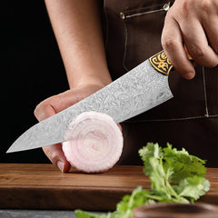 This 8-inch Japanese Damascus chef knife is the true workhorse of the kitchen. From slicing meats and filleting fish to chopping vegetables, herbs, and fruits, it’s designed to handle nearly every daily cutting task with ease. Whether you’re preparing a quick family dinner or crafting an elaborate meal, this knife becomes an extension of your hand.